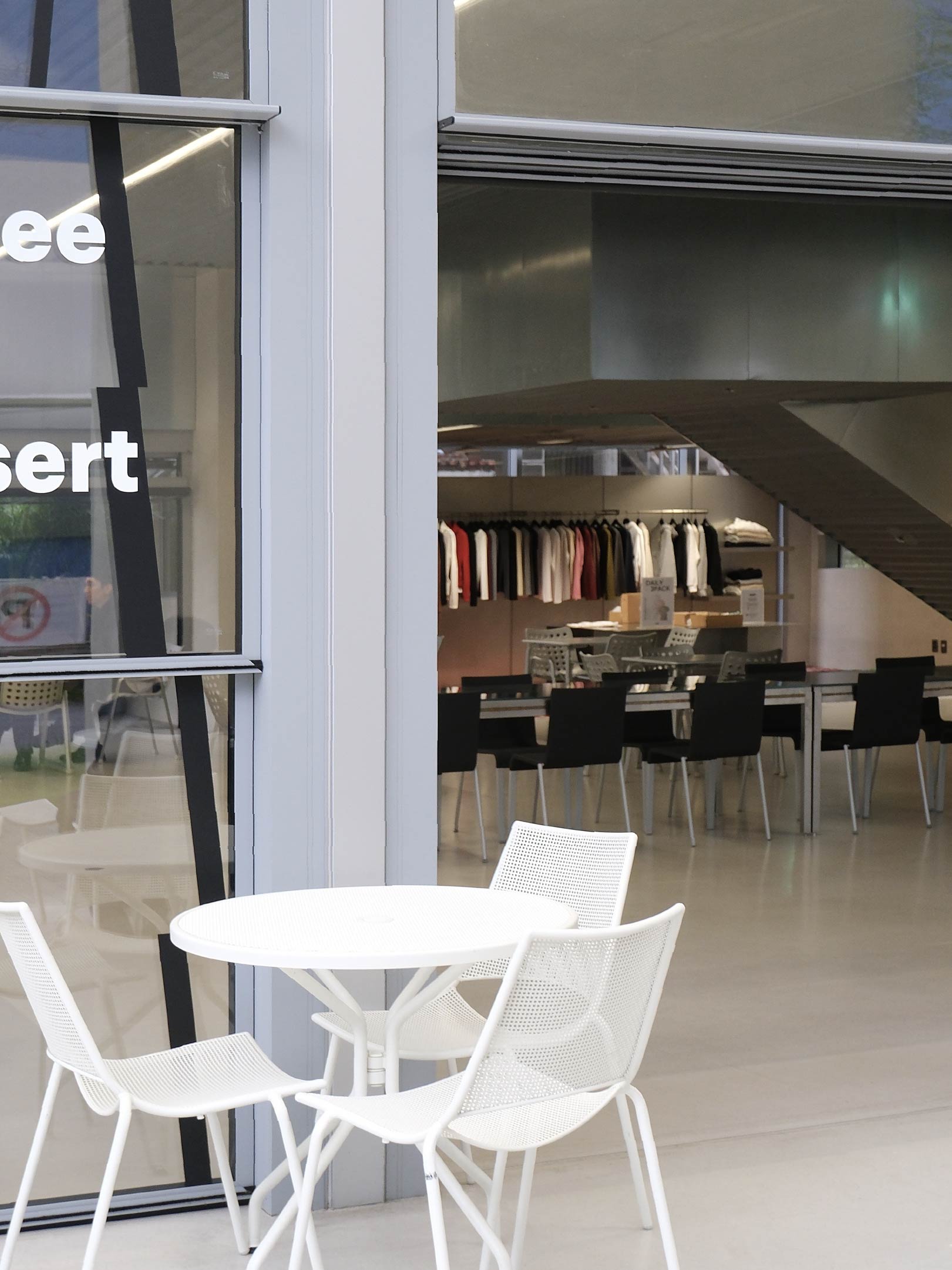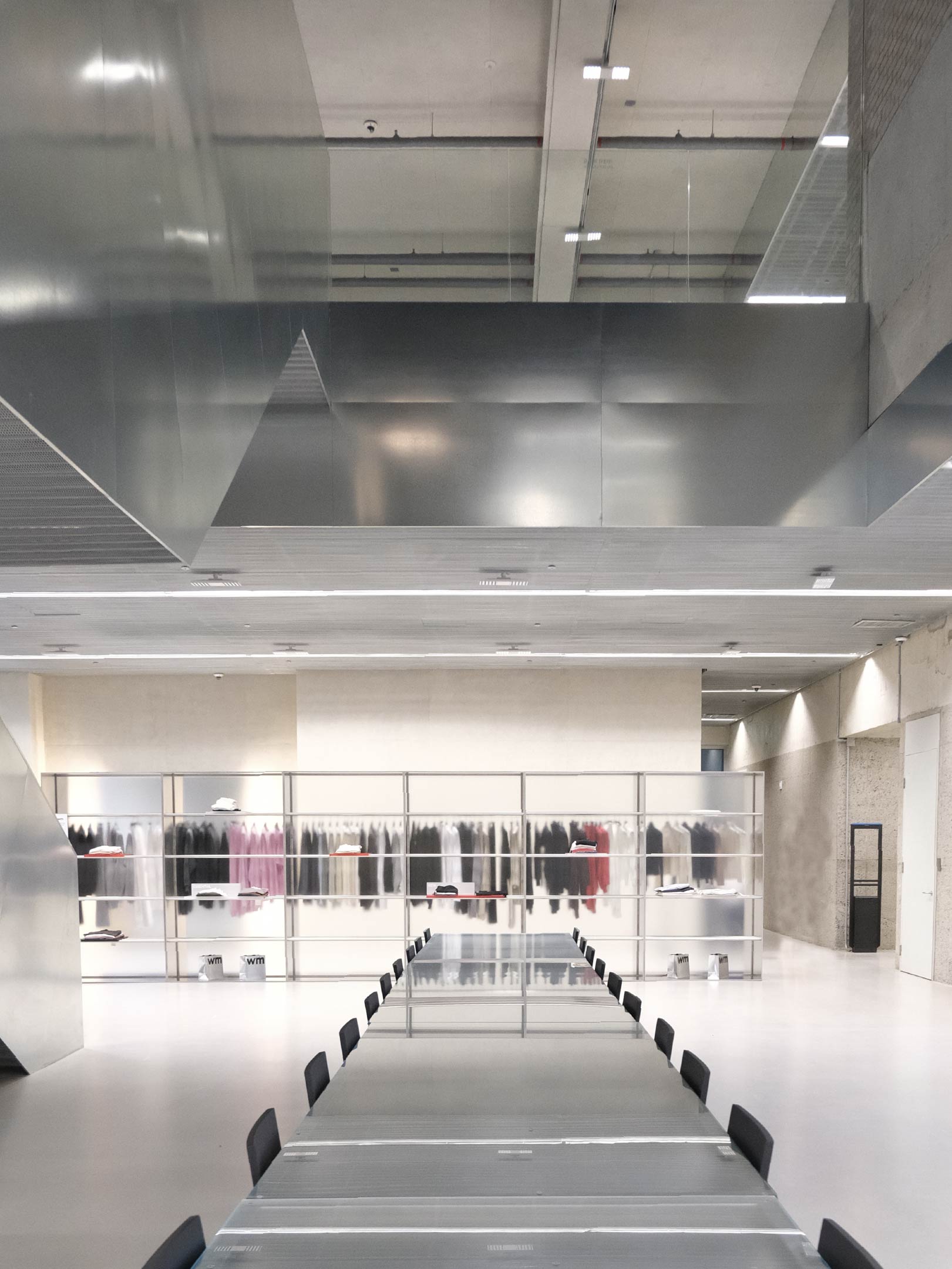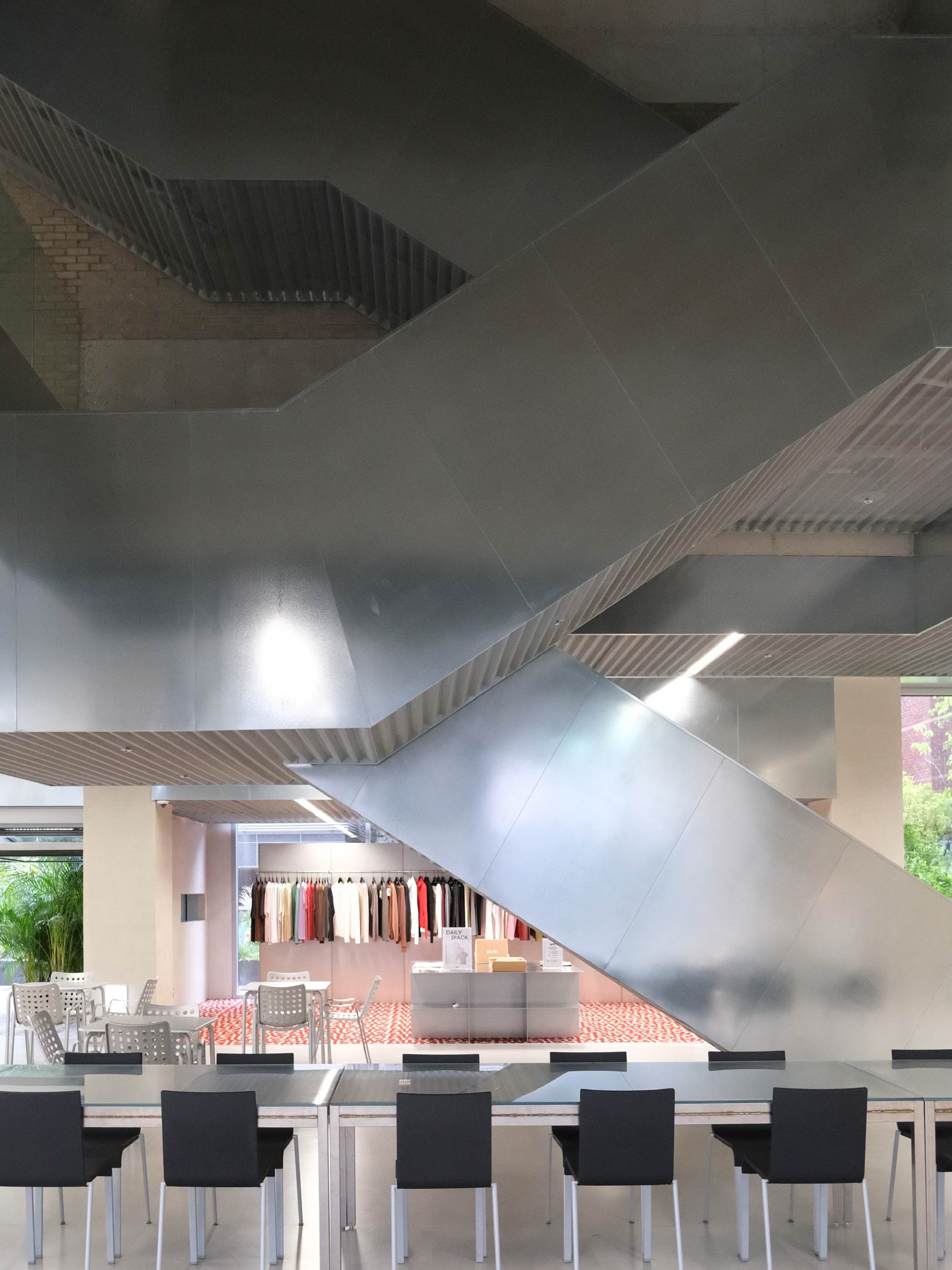 整棟建築自下而上垂直劃分為三大功能區域。首層作為開放的公共場域,串起花園、WM Café、紡織學院與展覽空間,像一個向城市敞開的客廳,邀請人們走入品牌的日常。