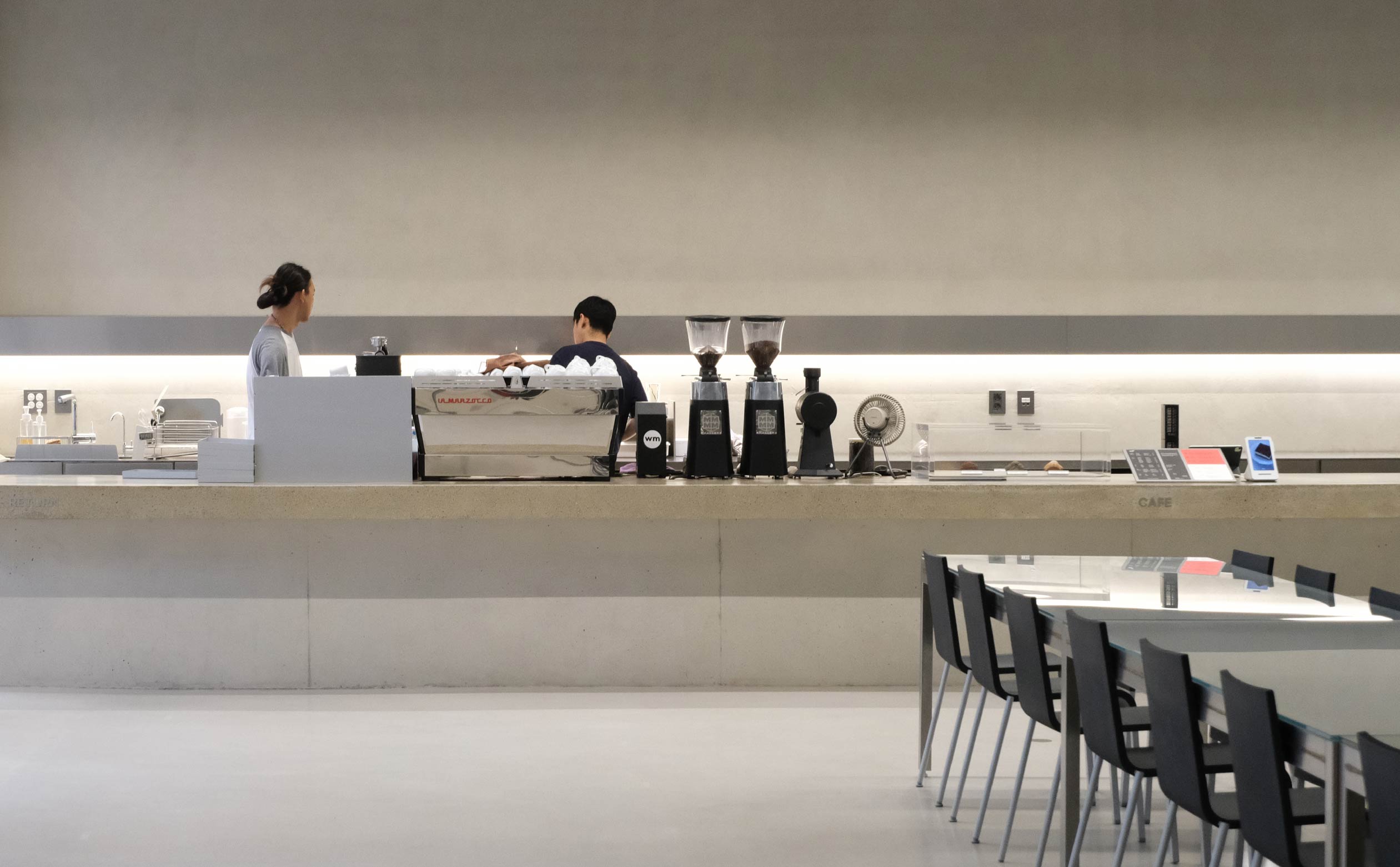 WM Café 的吧檯以極簡與理性線條為主調,延續整棟建築的素樸語彙。長形吧檯如同一條靜默的水平線,沉穩的礦物質質地與霧面灰調,讓空間氣氛專注而純淨。