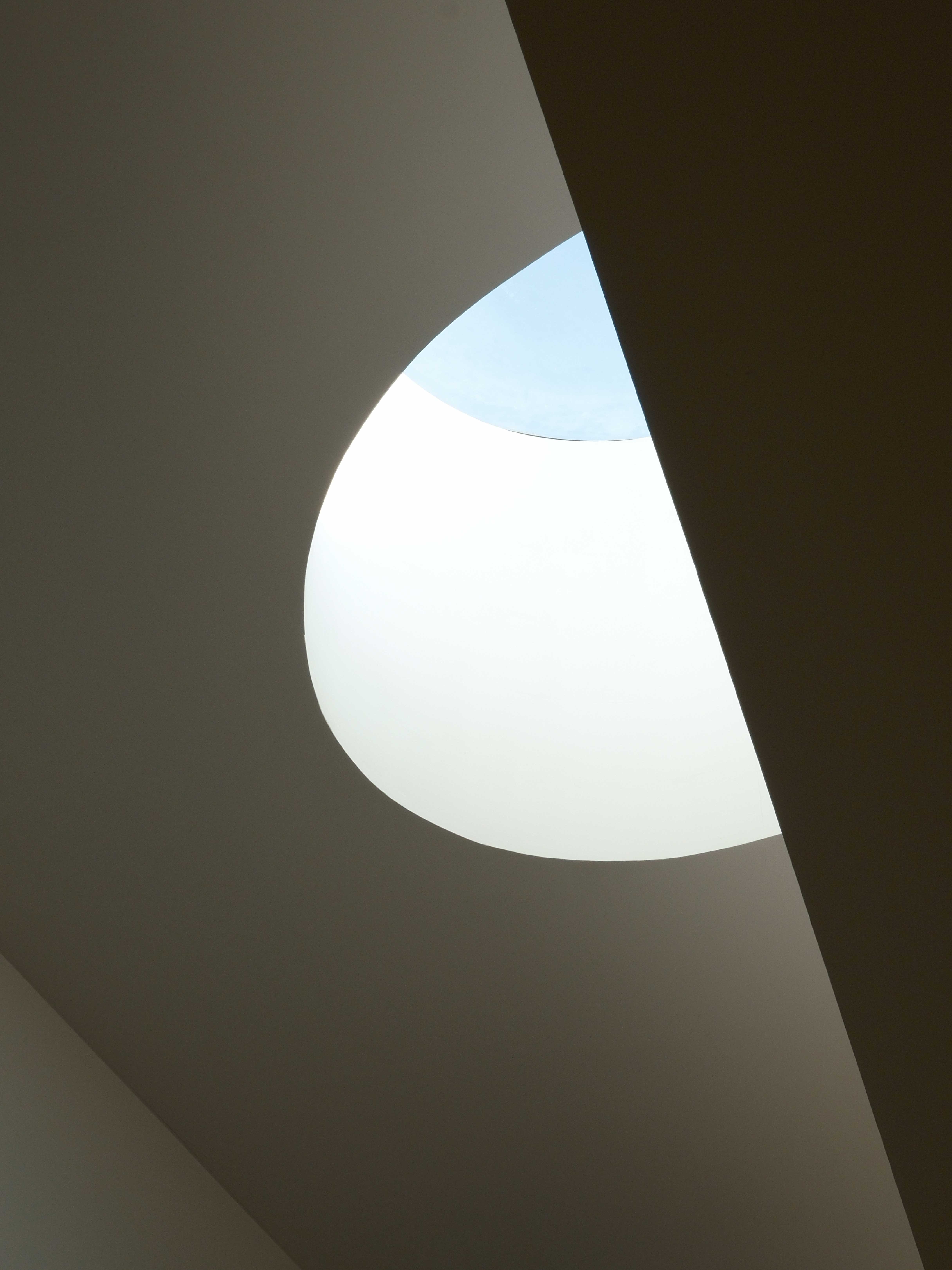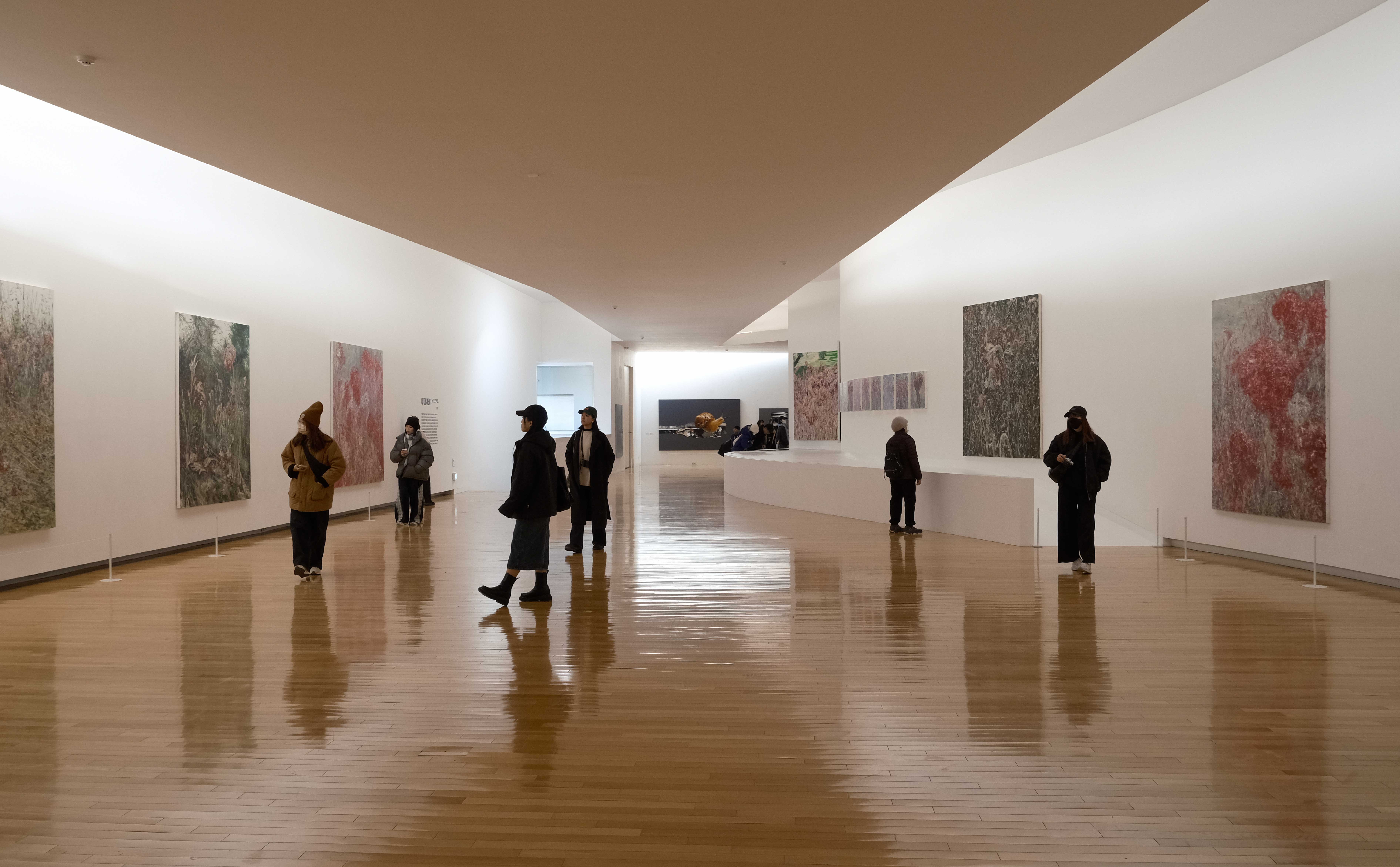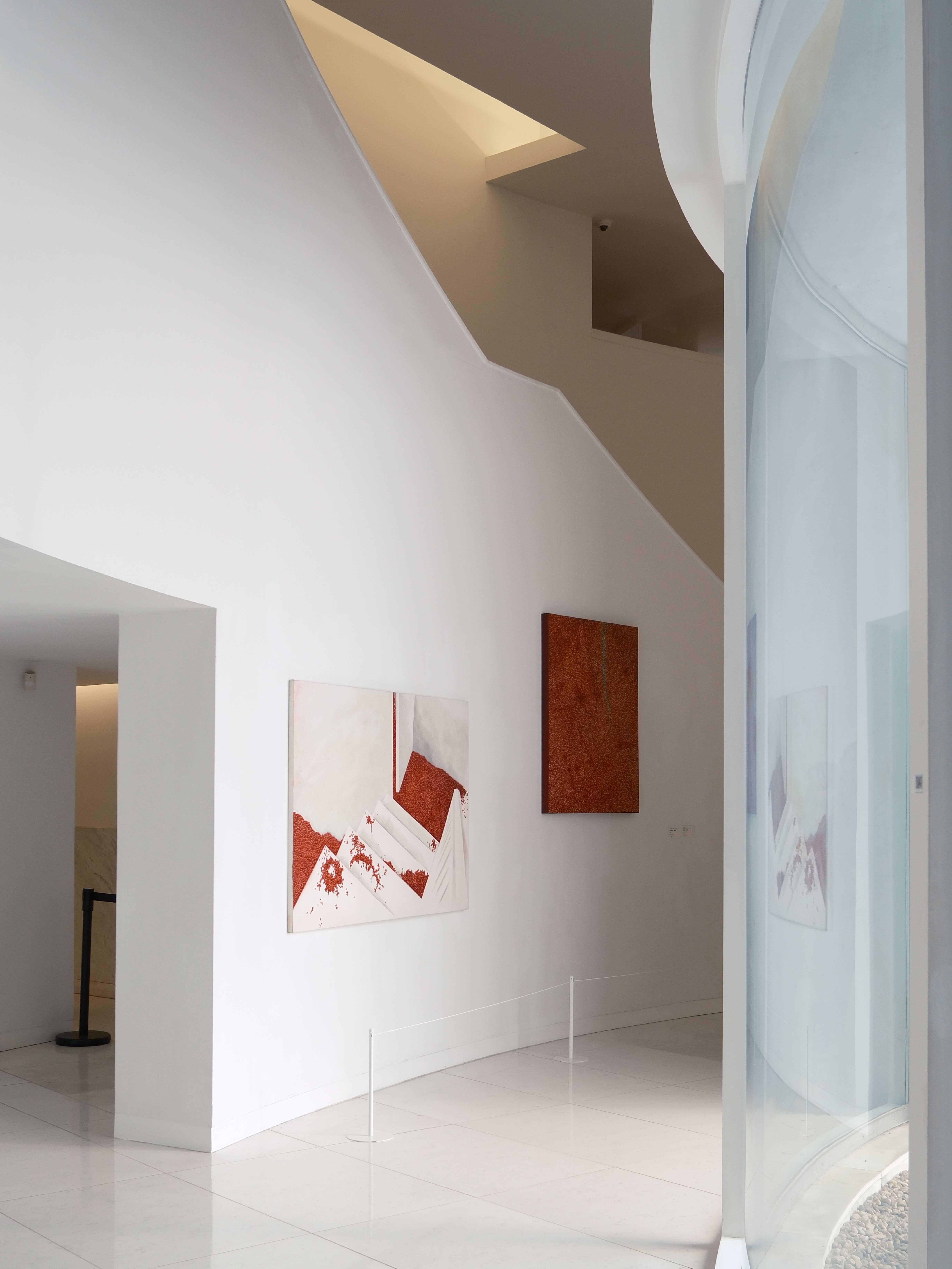 走入館內,空間氛圍安靜而純粹。自然光透過天窗與側窗灑入展廳,在白色牆面與地面上形成柔和的光影變化,使觀者在觀看作品的同時,也能感受到時間流動。展覽動線隨著建築曲面緩緩展開,沒有過度複雜的設計,而是讓人以自然的步伐穿梭其間,逐步與藝術作品相遇。